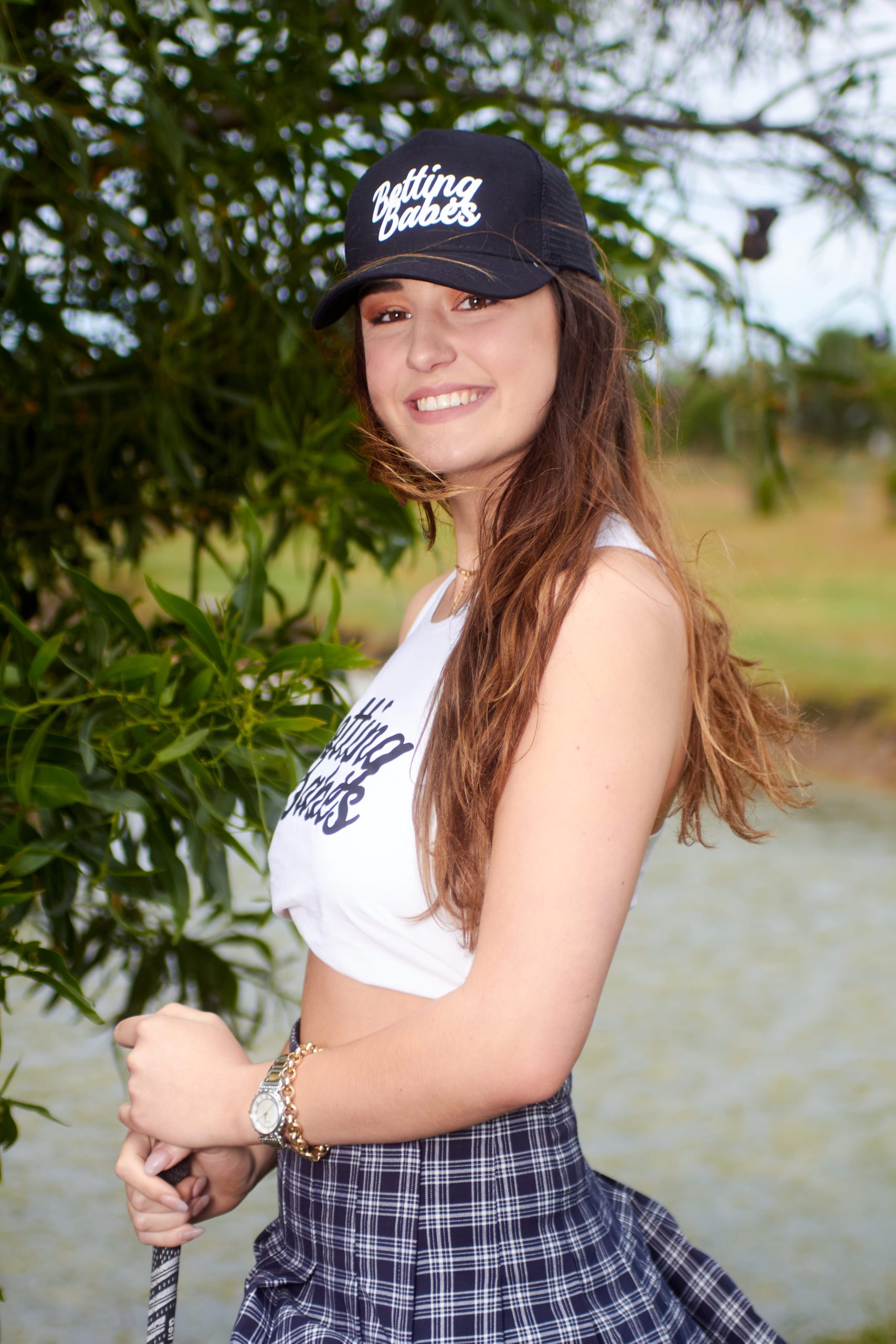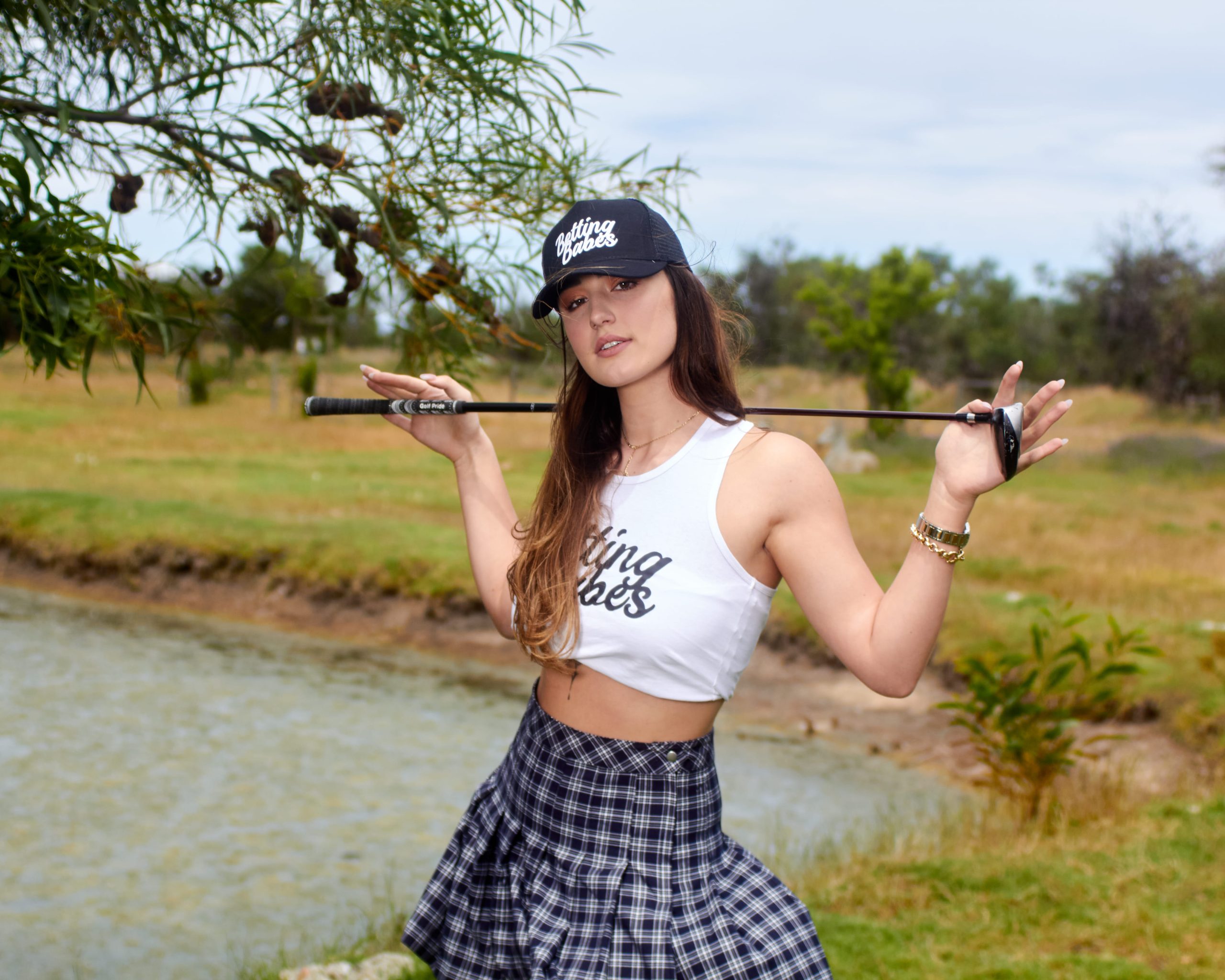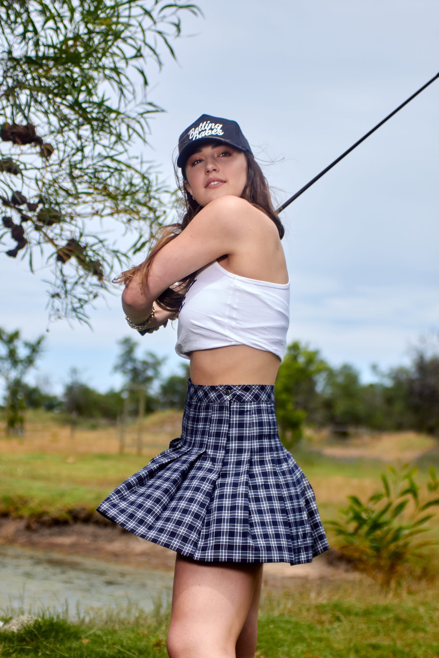 Carmyn took to the greens in her plaid golf skirt and Betting Babes cap for a golf-themed shoot that seamlessly blends sportiness with allure. With her club swung confidently over her shoulder and her captivating smile, she embodies the ultimate golfer babe. Against the serene backdrop of rolling fairways and gentle water features, she shows off her flair for golf while striking poses that are sure to make any golfer double-bogey.