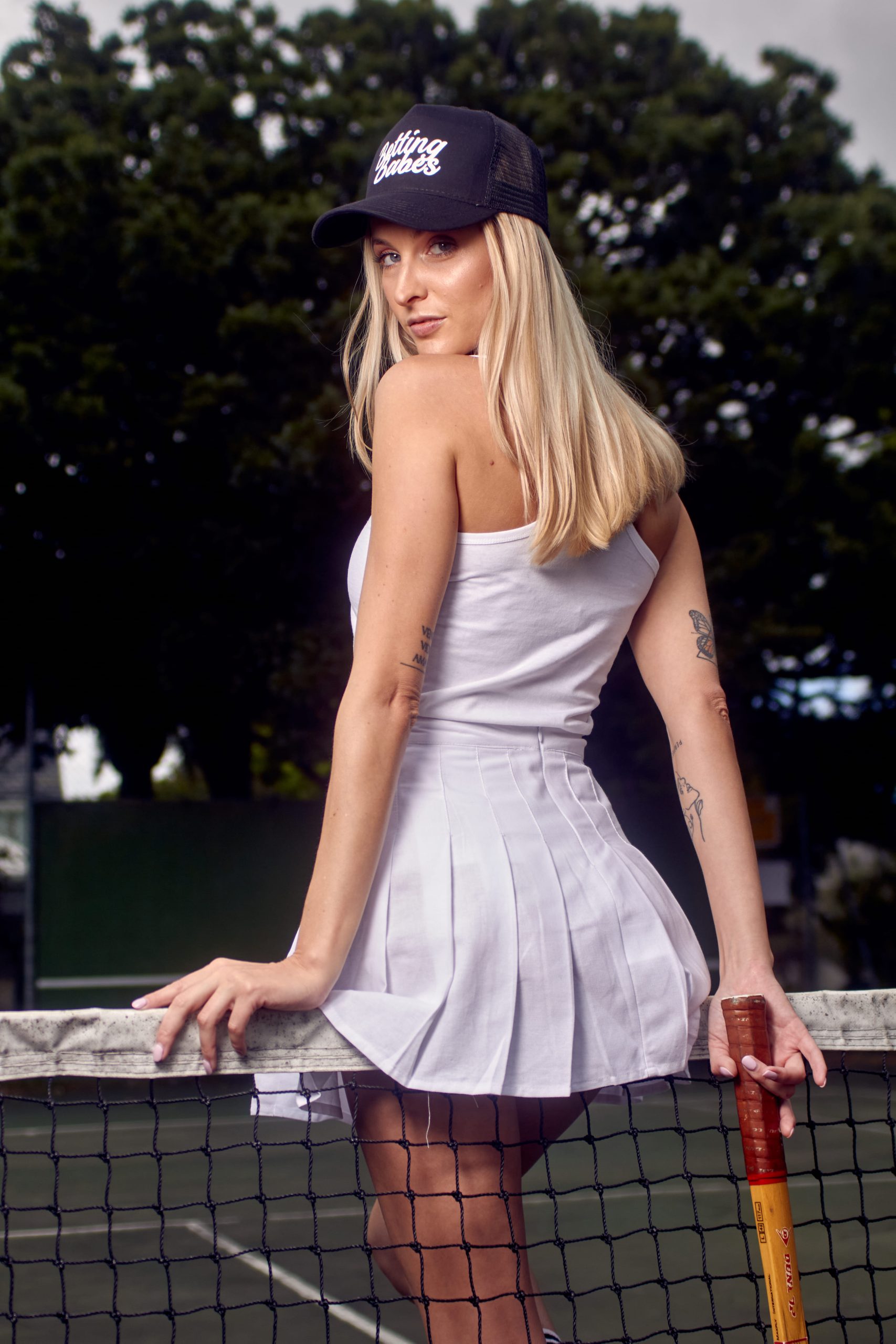 Ronette, draped in a classic white tennis skirt and a snug Betting Babes tank top, perfectly captures the essence of this beloved sport. Her poised stance by the net, racket in hand, not only shows off her athletic form but also embodies the spirit of both casual and serious punters who track every volley and serve.